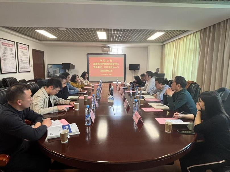 2月28日下午,湖南省科学技术信息研究所党委书记、所长李贵龙一行6人到我所调研交流。党委书记汪仕勇接待调研组一行并主持召开座谈交流会,副所长高燕、傅依达参加。