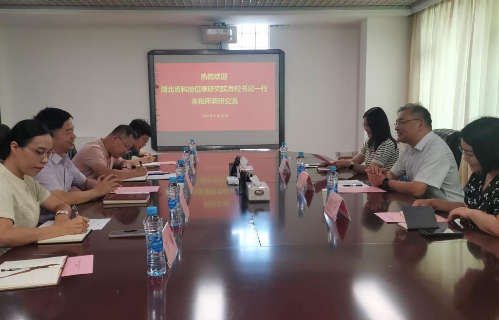 8月23日,湖北省科技信息研究院党委书记肖松一行3人来我所调研交流。所党委书记汪仕勇,副所长傅依达,综合科、战略科相关人员参加交流座谈。