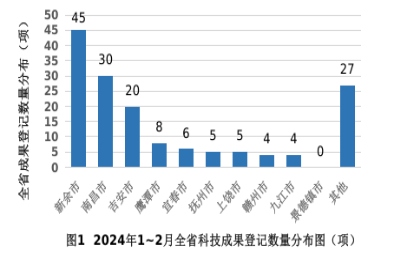 2024年1~2月,全省科技成果登记数量共计154项,其中,应用技术类科技成果151项、基础理论类科技成果3项。按设区市登记情况统计为:新余市45项、南昌市30项、吉安市20项、鹰潭市8项、宜春市6项、抚州市5项、上饶市5项、赣州市4项、九江市4项、景德镇市0项。其他省直机构、科研院所登记27项(见图1)。