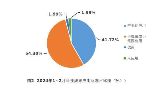 在151项应用技术成果中,产业化应用的成果有63项,占比41.72%;小批量或小范围应用的成果有82项,占比54.30%;试用的成果有3项,占比1.99%;未应用3项,占比1.99%(见图2)。