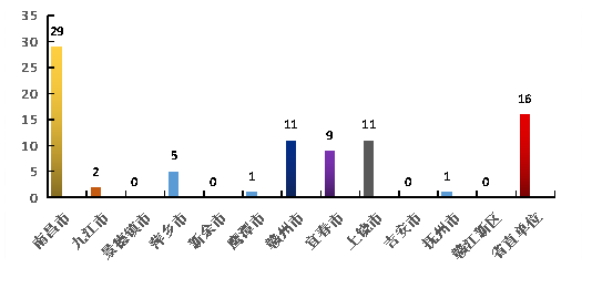 进入2025年,1-2月全省科技成果登记数量85项(应用技术类科技成果83项、基础理论类科技成果2项)。其中:南昌市29项、九江市2项、景德镇市0项、萍乡市5项、新余市0项、鹰潭市1项、赣州市11项、宜春市9项、上饶市11项、吉安市0项、抚州市1项、赣江新区0项、省直单位登记16项(见图1)。