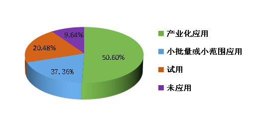 在83项应用技术成果中,产业化应用成果42项,占比50.60%;小批量或小范围应用成果16项,占比19.28%;试用成果17项,占比20.48%;未应用成果8项,占比9.64%(见图2)。