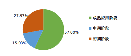 从应用技术类科技成果所属阶段分布来看,成熟应用阶段163项,占比57%;中期阶段43项,占比15.03%;初期阶段80项,占比27.97%(见图4)。