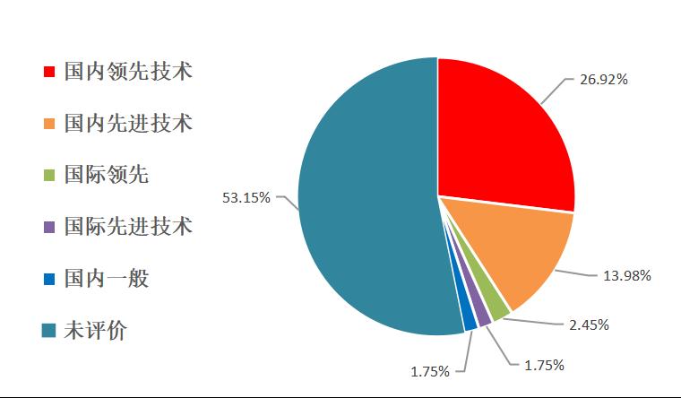 从应用技术类科技成果水平来看,国内领先技术有77项,占比26.92%。其中,新能源与节能领域表现突出,有29项、占比37.7%。国内先进40项,占比13.98%。其中,电子信息领域为主要板块,有24项、占比60%。国际领先7项,占比2.45%;国际先进5项,占比1.75%。此外,国内一般成果5项,占比1.75%;未评价152项,占比53.15%(见图5)。